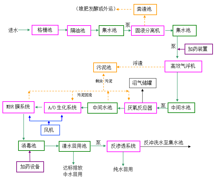 動(dòng)物屠宰加工過程中將產(chǎn)生一定量的廢水,廢水主要來自動(dòng)物屠宰后清洗、解體沖洗、內(nèi)臟清洗和地面沖洗以及糞便廢水等廢水。廢水中含有大量的有機(jī)物質(zhì),主要成分:動(dòng)物糞便、血液、動(dòng)物內(nèi)臟雜物、動(dòng)物體毛、碎皮肉和油脂等有機(jī)物,屬于高濃度有機(jī)廢水。廢水呈褐紅色,具有較強(qiáng)的腥臭味。這些廢水中的脂肪、蛋白質(zhì)等物質(zhì)不經(jīng)過處理,直接排入水體,將對其周圍水體造成嚴(yán)重富營養(yǎng)化,嚴(yán)重破壞水體的自盡能力,造成水體發(fā)黑變臭,影響環(huán)境和農(nóng)業(yè)灌溉。