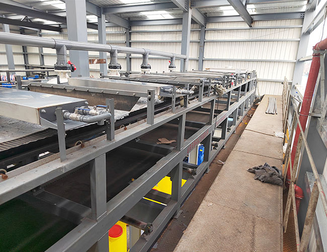 LBDU真空帶式過濾機是以真空負壓為推動力實現(xiàn)固液分離的設(shè)備,在結(jié)構(gòu)上,過濾區(qū)段沿水平長度方向布置,可以連續(xù)完成過濾、洗滌、吸干、濾布再生等作業(yè)。設(shè)備具有自動化程度高、生產(chǎn)能力大、洗滌效果好、濾餅水分低、操作靈活,維修簡單等優(yōu)點。廣泛應(yīng)用于冶金、礦山、化工、造紙、食品、制藥、環(huán)保等行業(yè)。
