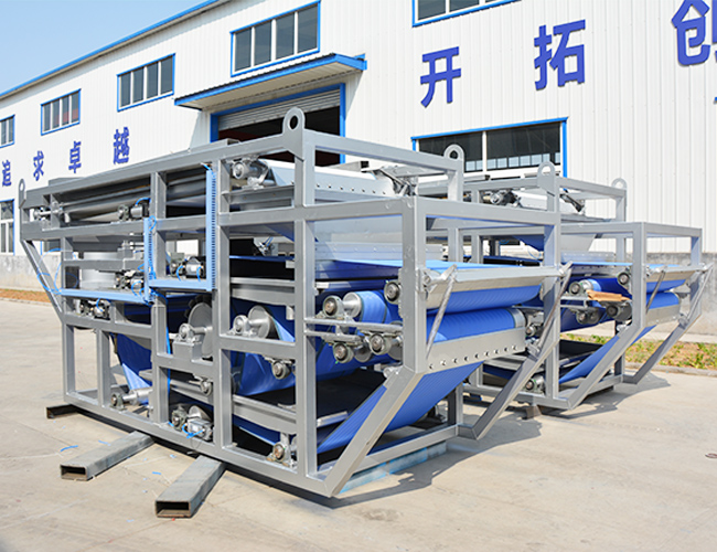 LBDD帶式壓濾機(jī)由若干個(gè)不同直徑的輥筒及安裝在支架上的攪拌罐組成,由傳動(dòng)輥帶動(dòng)的上、中、下網(wǎng)、脫水輥、漲緊輥、導(dǎo)輥、糾偏裝置以及脫水輥兩端的密封裝置組成。濾網(wǎng)采用壓縮空氣氣壓漲緊,使整條網(wǎng)帶保持恒定漲力,不會(huì)因進(jìn)料量的變化而引起漲力的變化,該機(jī)還配備氣動(dòng)調(diào)偏裝置,更方便操作和管理,更為新型實(shí)用的特點(diǎn)是在至少一個(gè)或多個(gè)脫水輥兩端設(shè)有密封裝置,該密封裝置由密封帶和驅(qū)動(dòng)密封帶的滾輪組成,密封帶壓置在上網(wǎng)和下網(wǎng)重疊后的橫向兩端,且在滾輪間設(shè)有一漲緊輥。隨著脫水輥的轉(zhuǎn)動(dòng),帶動(dòng)密封帶及輥輪從動(dòng)轉(zhuǎn)動(dòng),這樣,中、下網(wǎng)之間的漿料除受到脫水輥的擠壓作用外,還受到密封帶的擠壓,從而起到強(qiáng)化脫水和密封漿料的目的。